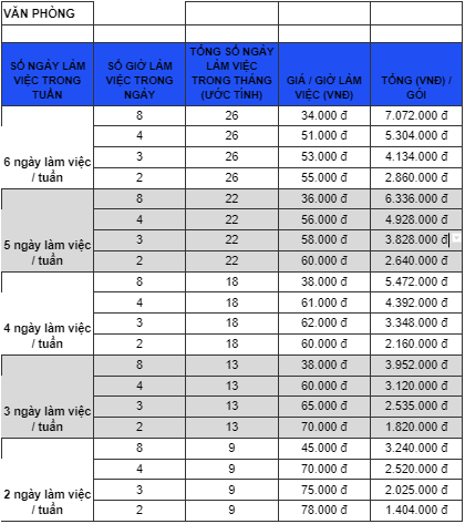 Với nhu cầu cần thuê người vệ sinh hằng ngày cho hộ gia đình được tăng cao. Hiểu được nhu cầu và chi phí phù hợp cho từng mỗi gia đình. Sau đây là bảng giá thuê giúp việc đến quý khách: